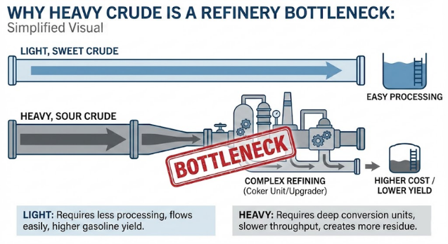 Much of Venezuela’s export blend is heavy and high in sulphur. Heavy crude is thicker, produces more residue, and requires complex refinery hardware to process efficiently. Only a subset of refineries can run it properly at scale, typically facilities with coking units and deep desulphurisation capability.